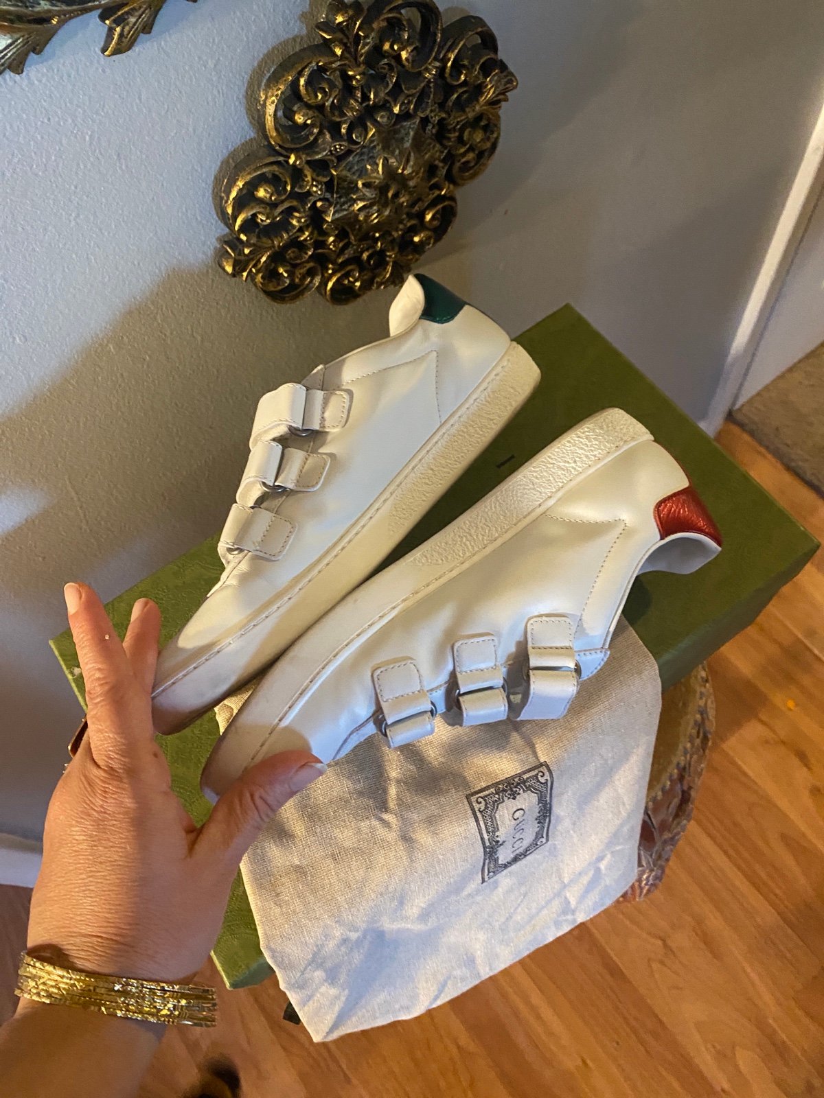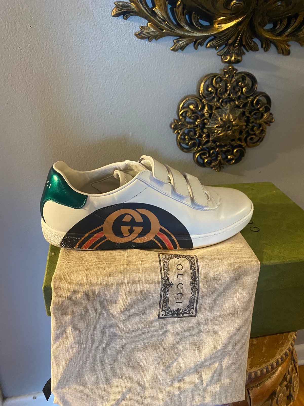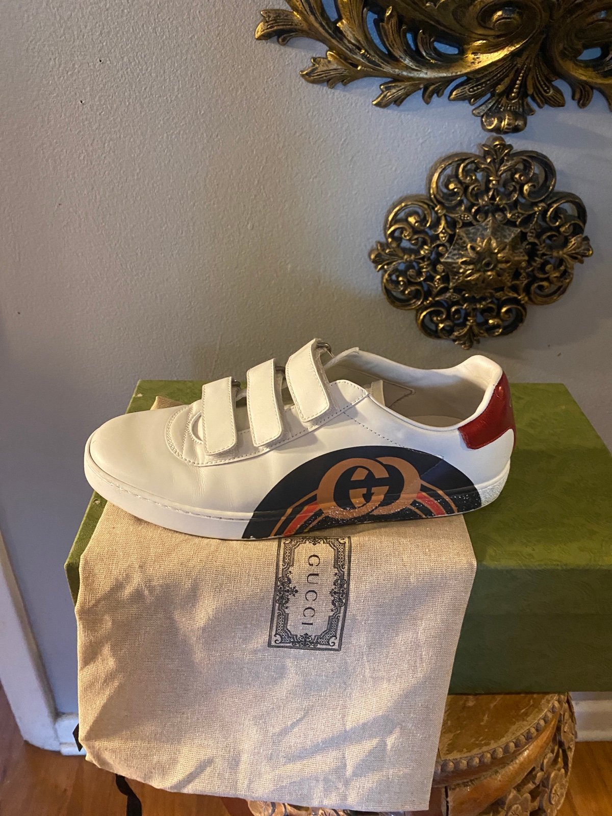These sneakers are crafted of white leather with a Gucci interlocking GG logo print at the sides, metallic leather at the backstay, and adjustable strap closure.