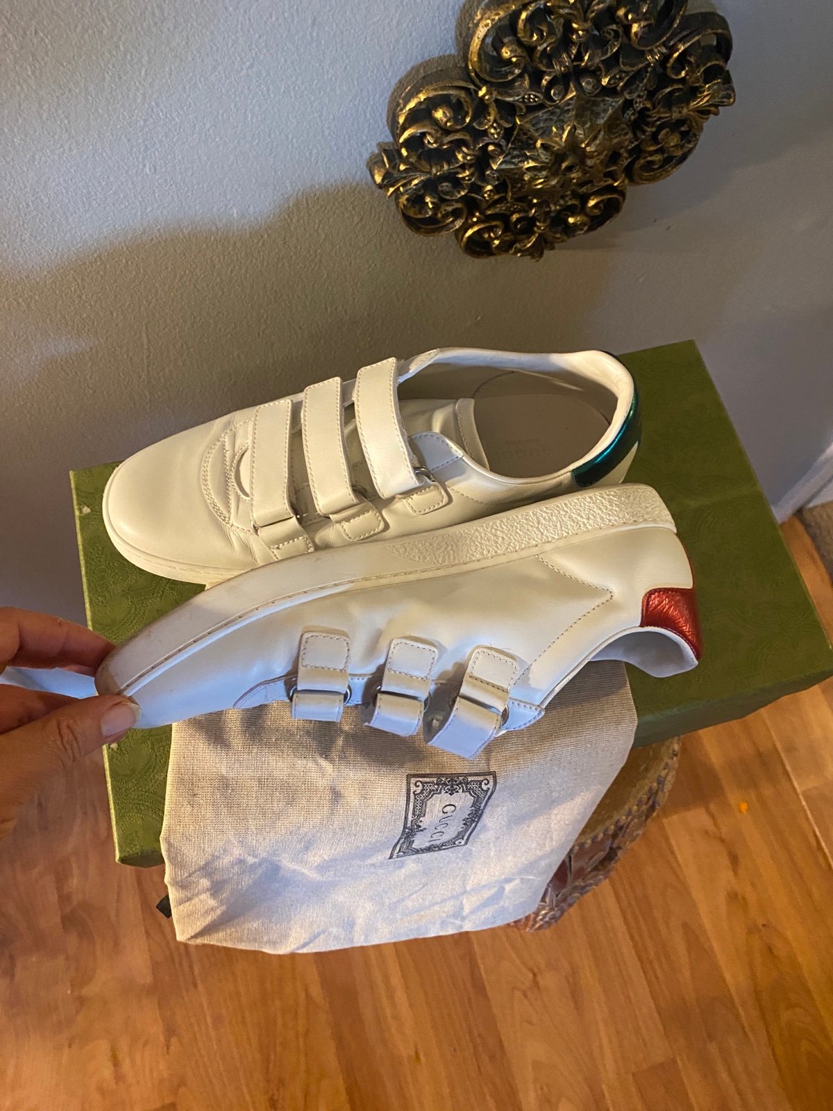 COLOR: White.Red, Green. Size : 10. Chic Gucci sneakers for kids. White base with striking red and green accents. Gold logo detail adds elegance. Ideal for stylish outings. Comes with Original Gucci Box with a Dust Bag.