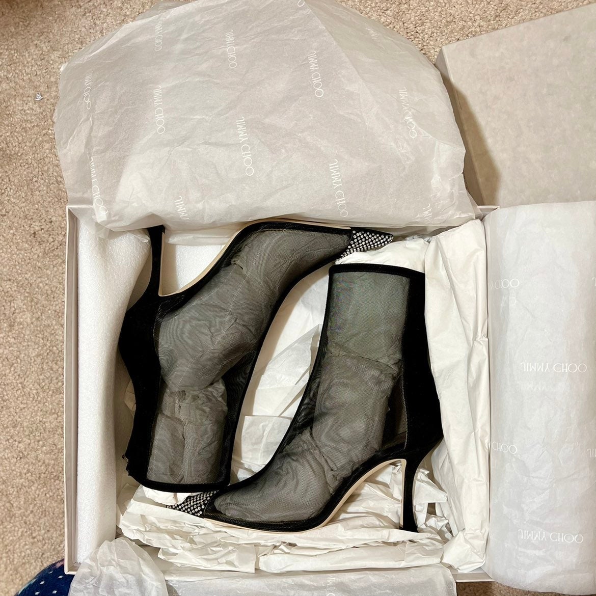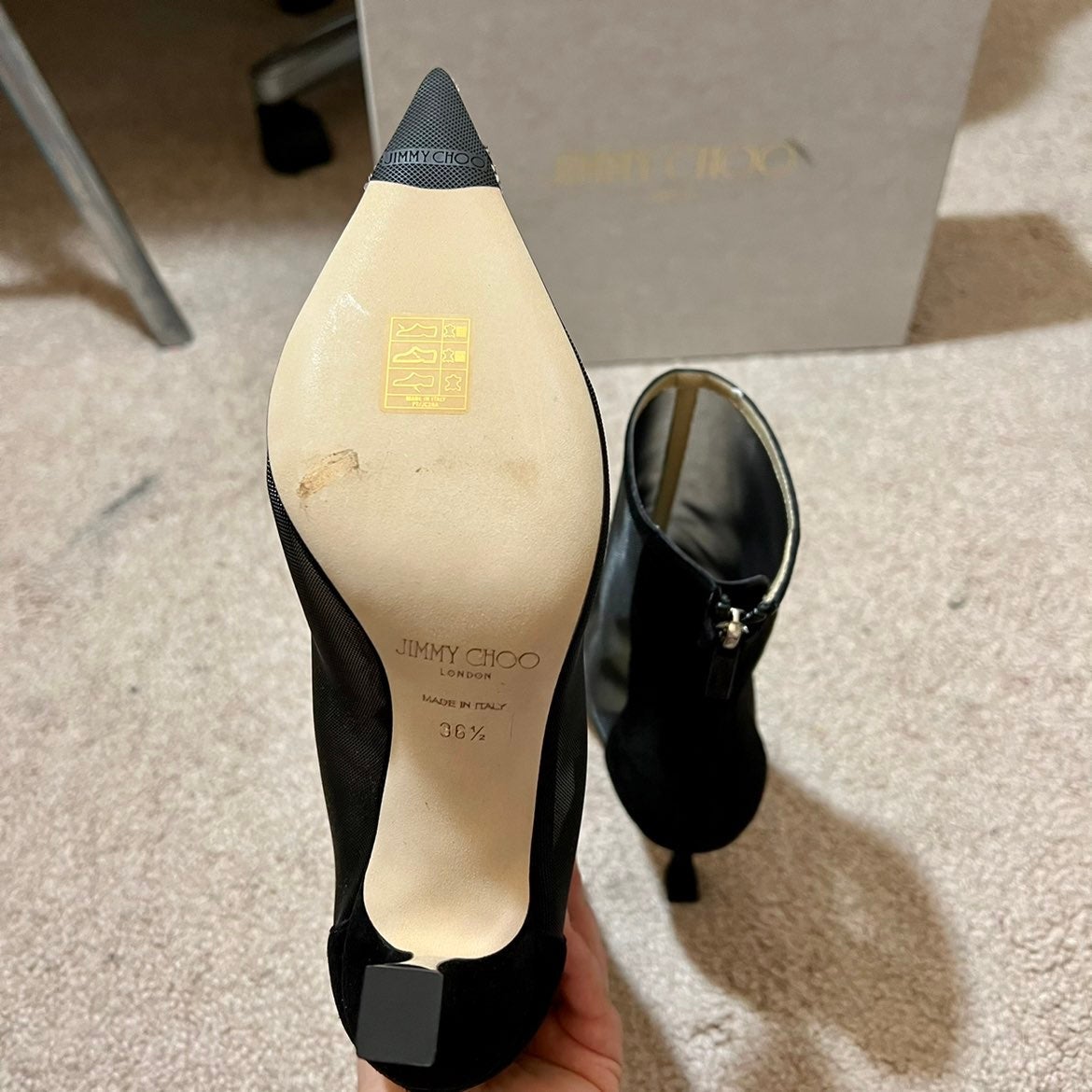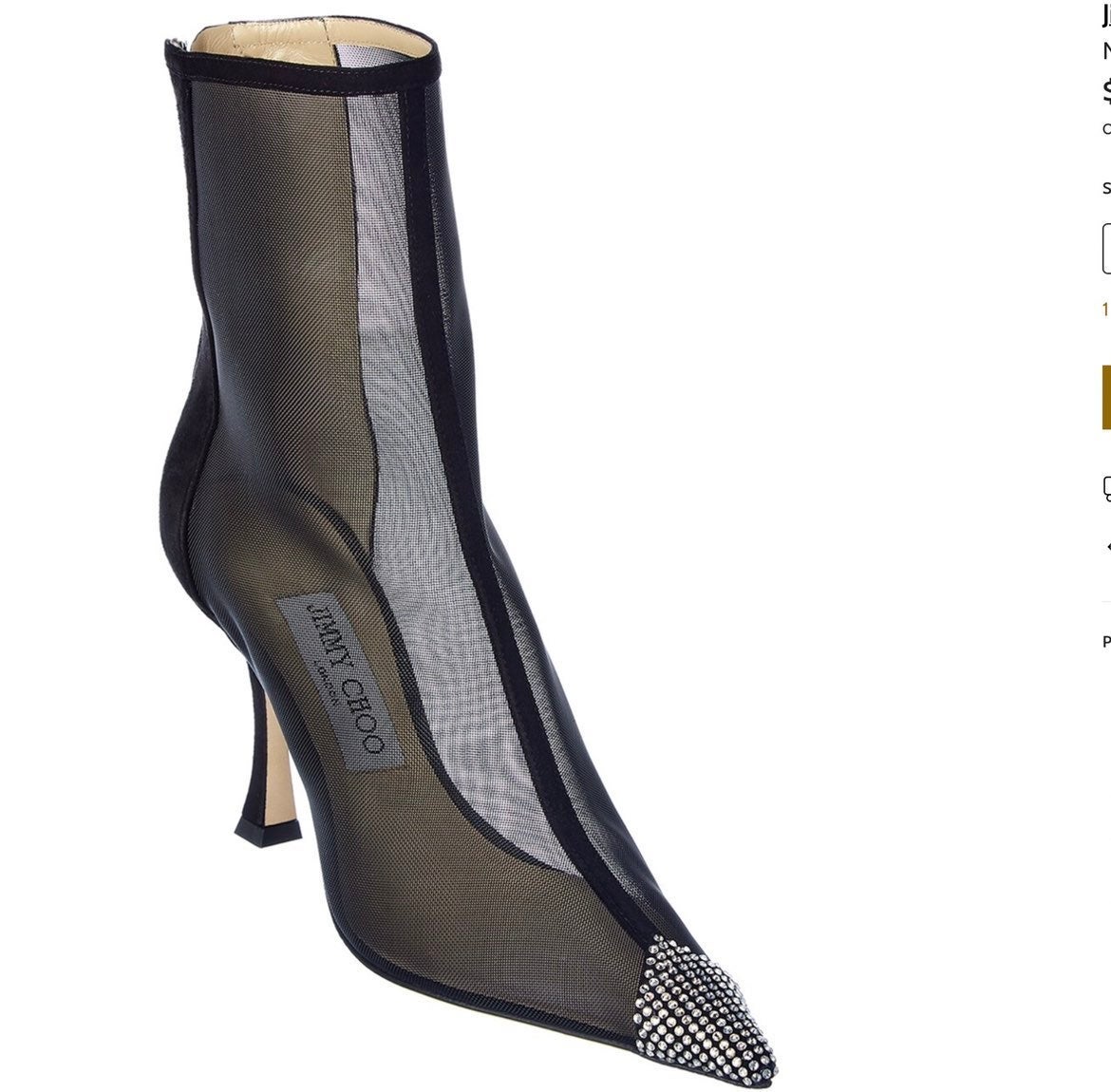 * Naidoo 90 Mesh & Suede Bootie in black mesh and suede and silver-tone hardware with crystal-embellished pointy-toe