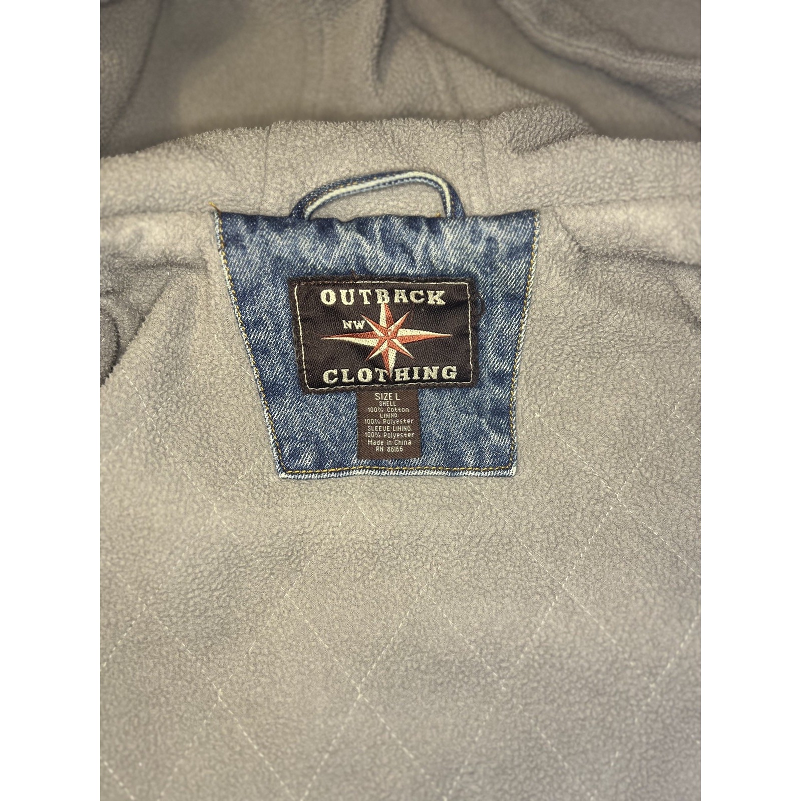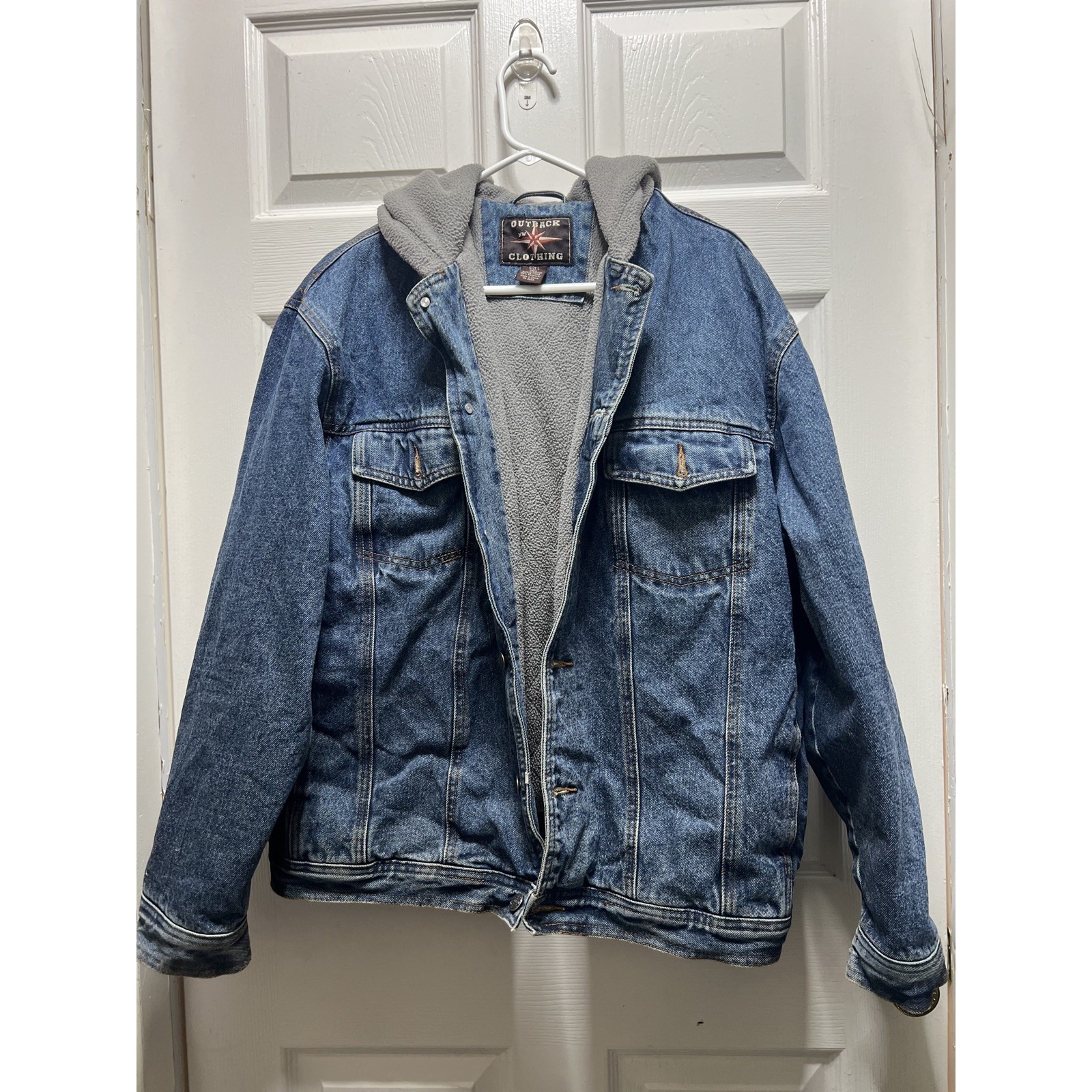 Introducing an Outback Clothing Men's Jean Jacket in size L, perfect for the colder months. This jacket is made of heavy cotton with a cozy fleece lining to keep you warm. The blue jacket features a classic jean style with a button-up front and two chest pockets. The jacket is designed for regular fit and is categorized under Clothing, Shoes & Accessories, Men's Clothing, Coats, Jackets & Vests.