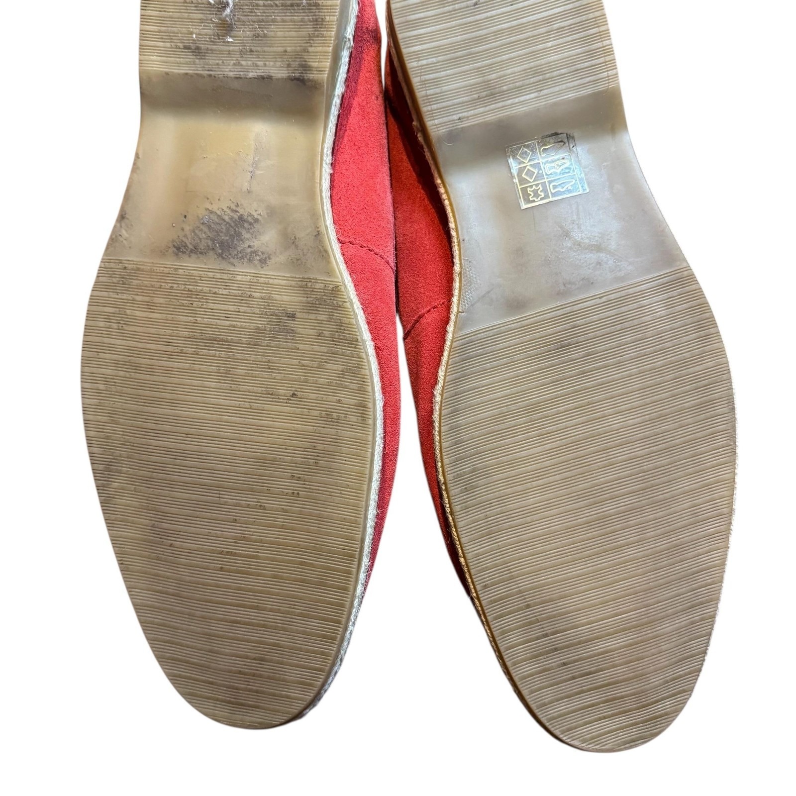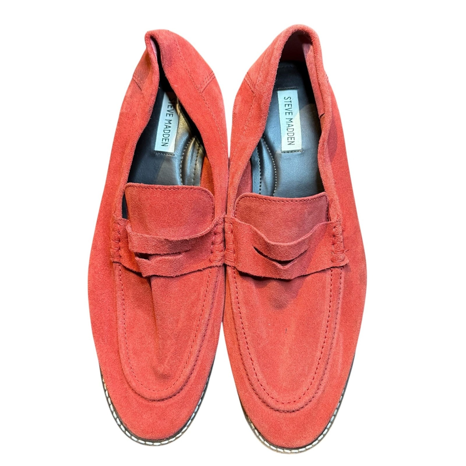 Style: Levon Red Suede slip-on loafers with penny strap detail and moc toe.