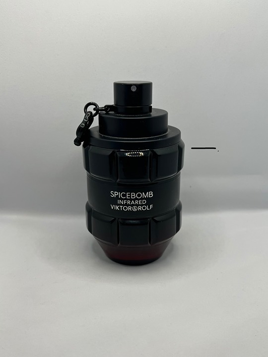 3 oz. bottle of V&R Spicebomb Infrared EDT. The original Spicebomb DNA with added pepper and red berries. Fragrance level is shown or marked (nearly full). Box not included.